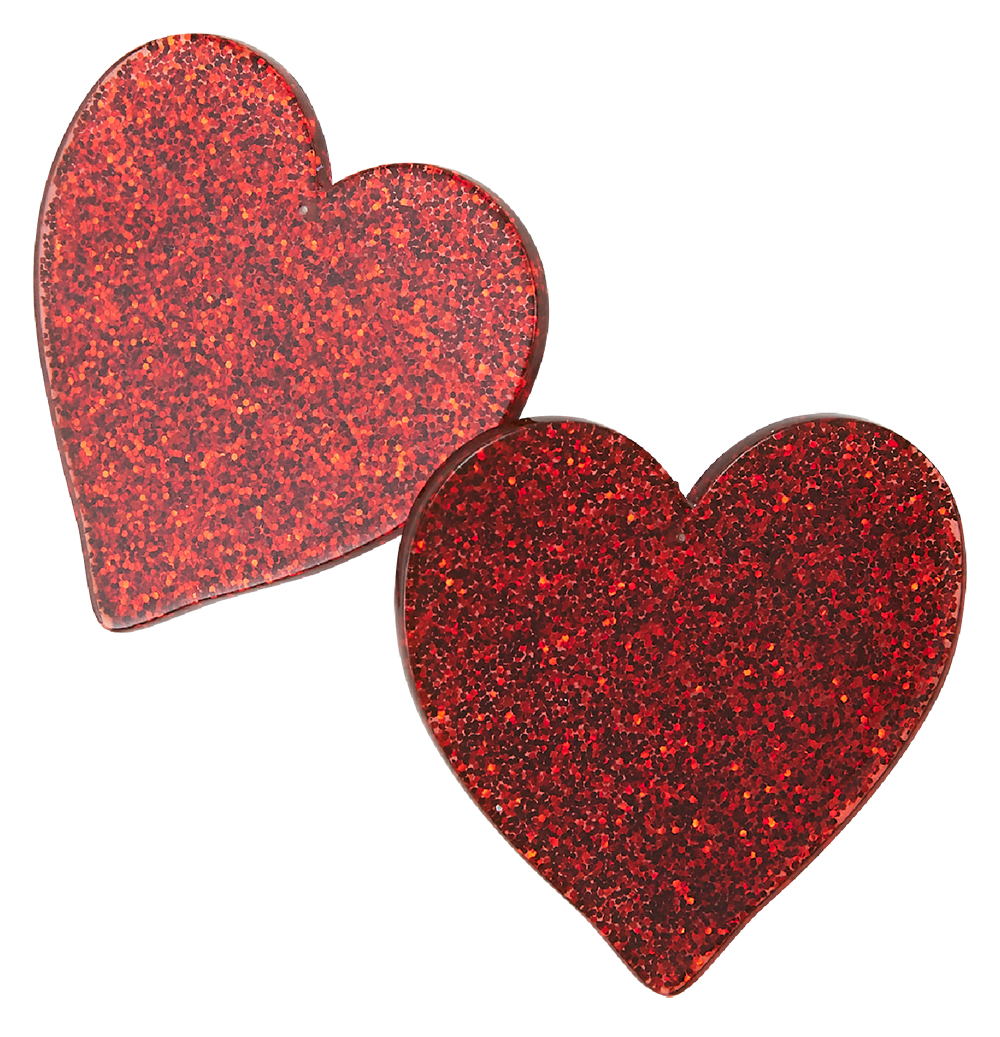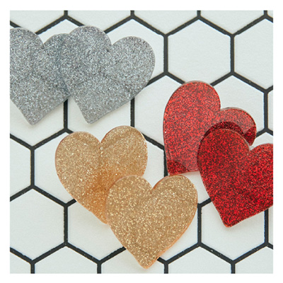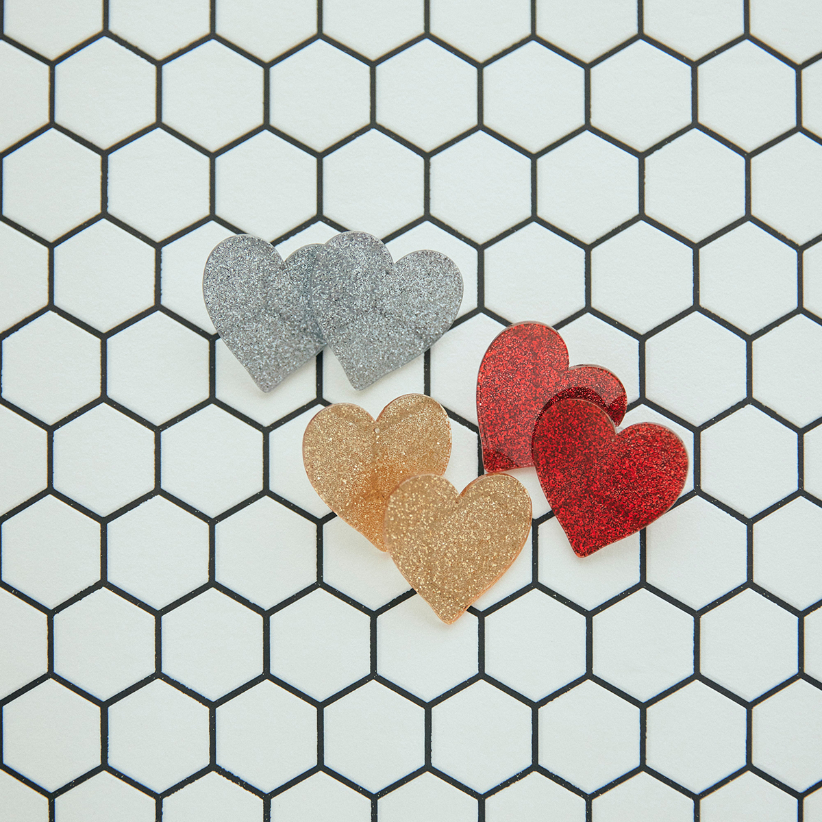 眺めているだけで心が浮き立つ、キラキラのラメ感がかわいいハート型ピアス。赤やゴールド、シルバーなど、キャッチーなカラーで顔まわりを彩って。