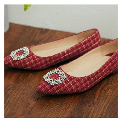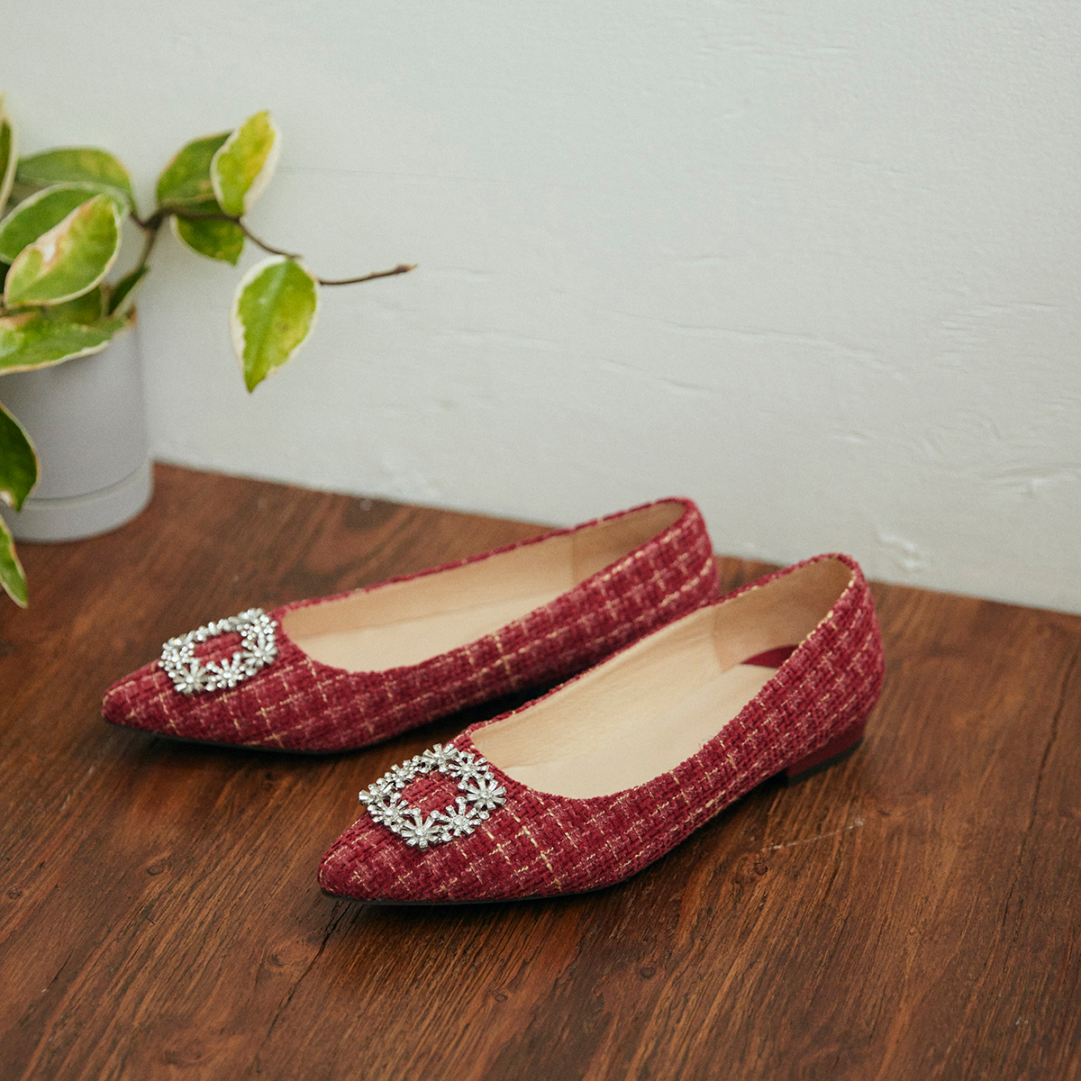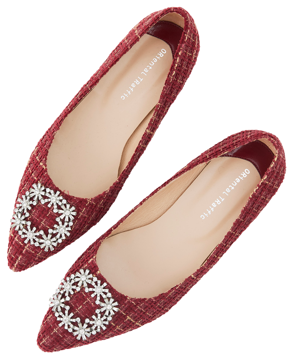 ラメ糸を織り交ぜた赤いツイード素材のパンプスで、秋冬のスタイリングに温もりをプラス。きらめくビジューをあしらって一層華やかな足元に。