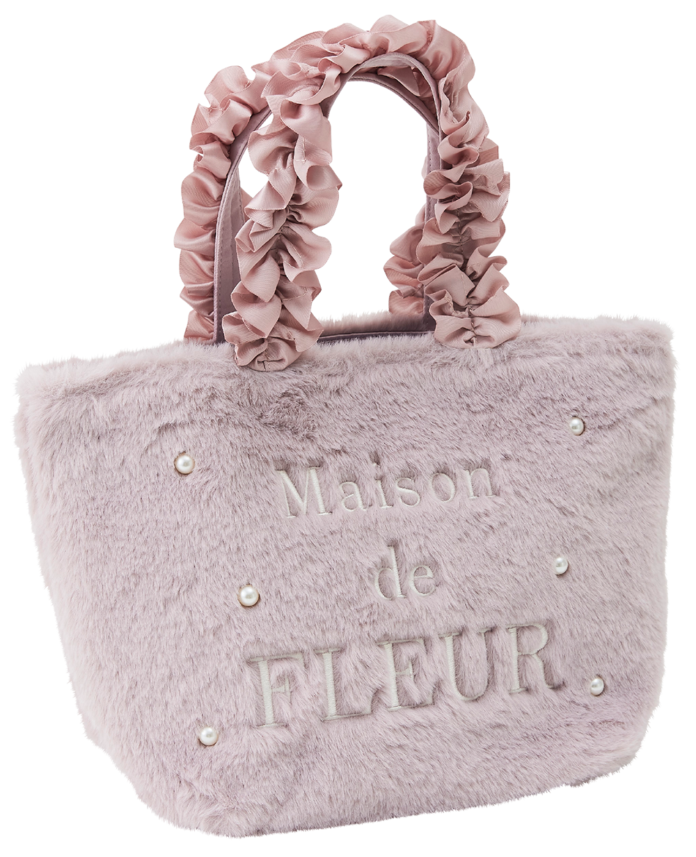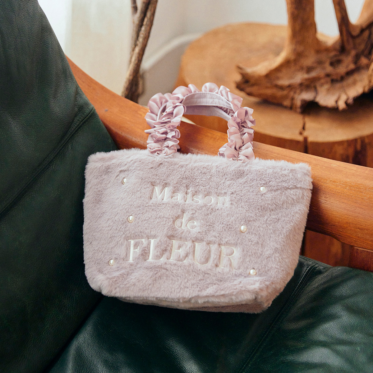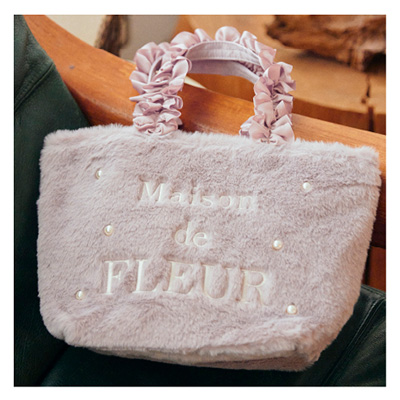 トレンドのファー素材を使ったバッグは、淡いラベンダーカラーが今の気分。ブランドらしいフリルハンドルやパールの光沢感が愛らしさを引き立てる。