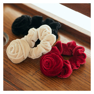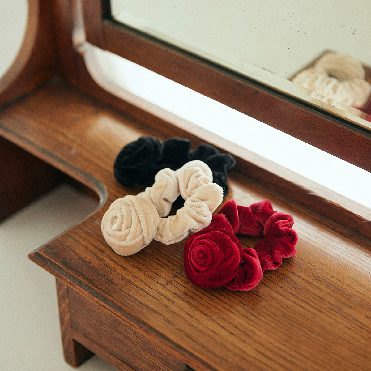 旬のバラモチーフをベロア素材で表現したエレガントなシュシュ。簡単なアレンジヘアに取り入れるだけで、今っぽさとシーズナルムードを両立できる。