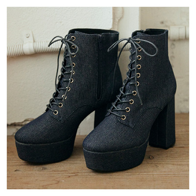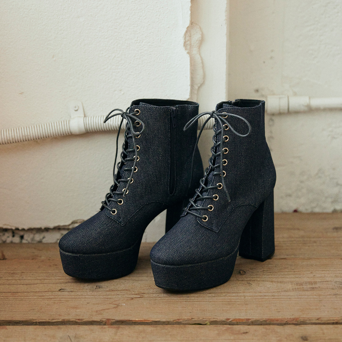 着脱ラクちんな内側ファスナー式のレースアップブーツ。着こなしをイマドキにアップデートしたいなら、インディゴブルーのデニム素材に決まり!