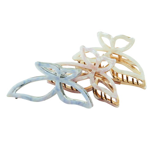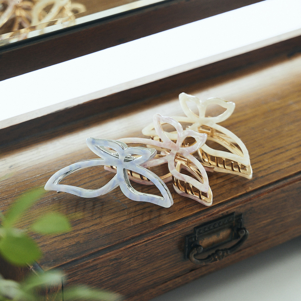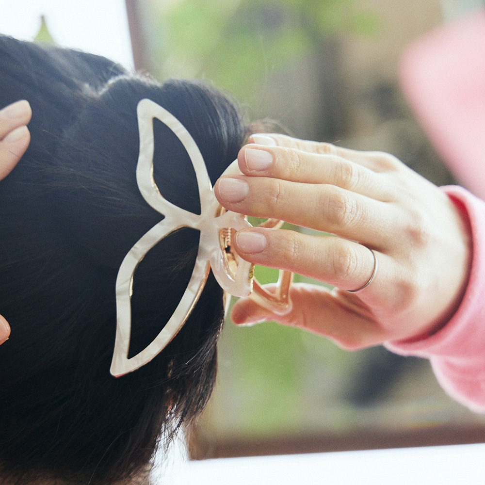 蝶の羽をモチーフにしたヘアクリップは、パステル調のカラーが春にぴったり。サッと髪をまとめられるので忙しい朝に重宝。