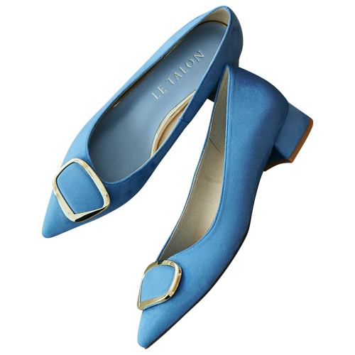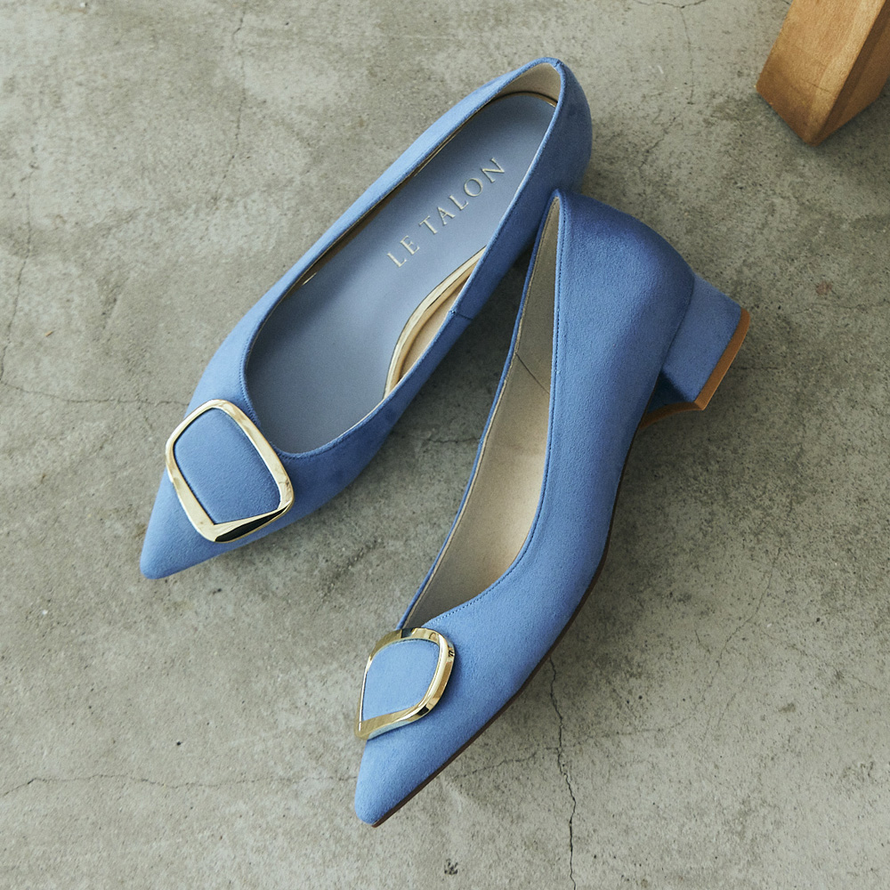 足元がきれいに見えるポインテッドトゥながら、やや太めのローヒールで歩きやすい一足。爽やかなサックスブルーで春っぽく。
