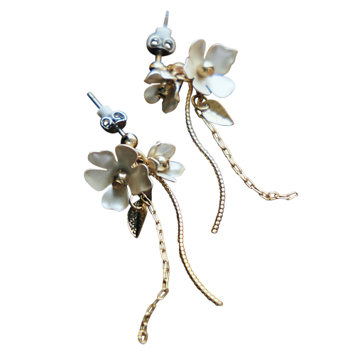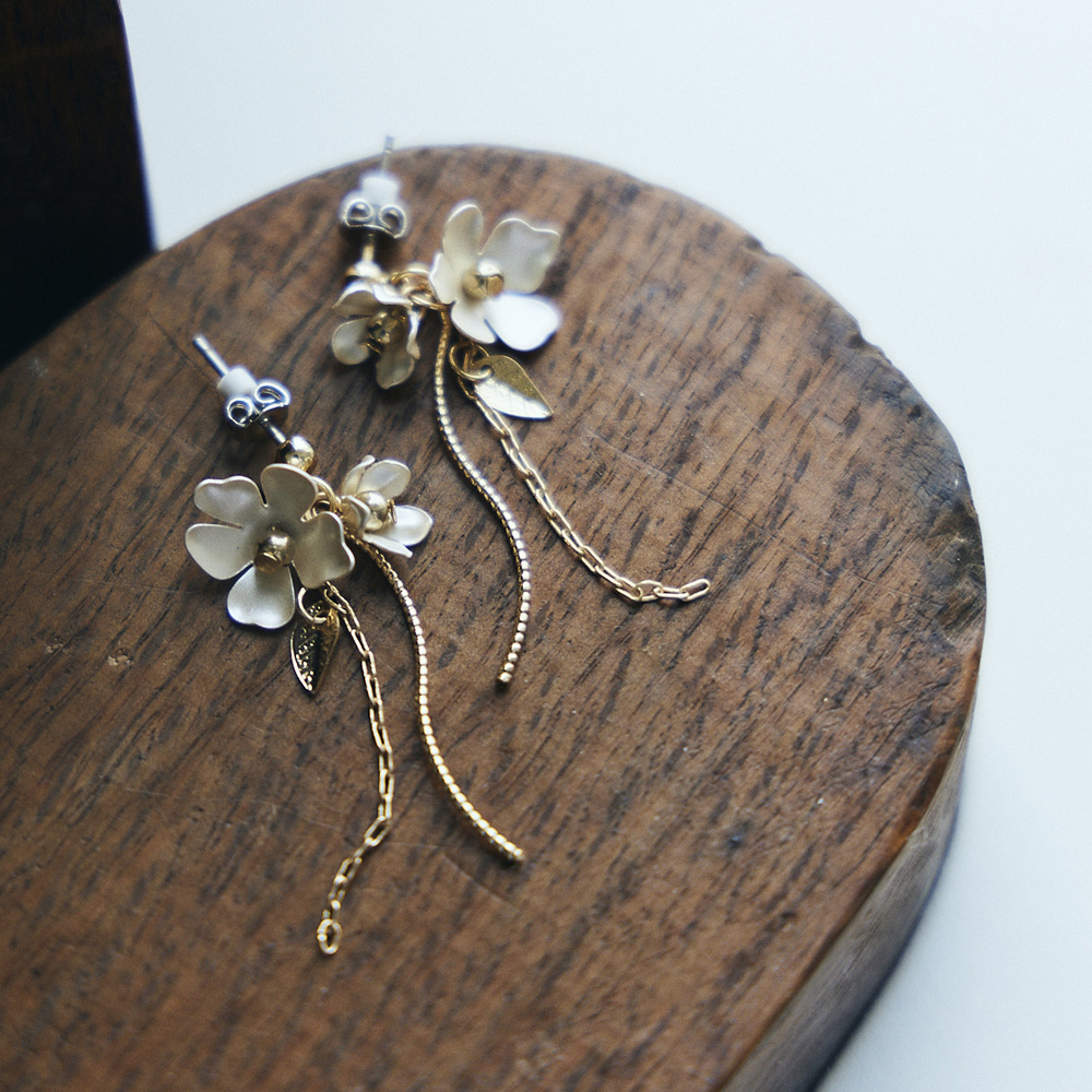 耳元で揺れるフラワーとリーフが上品なムードを演出。金属アレルギーを引き起こしにくいとされるチタン素材を用いたピアス。