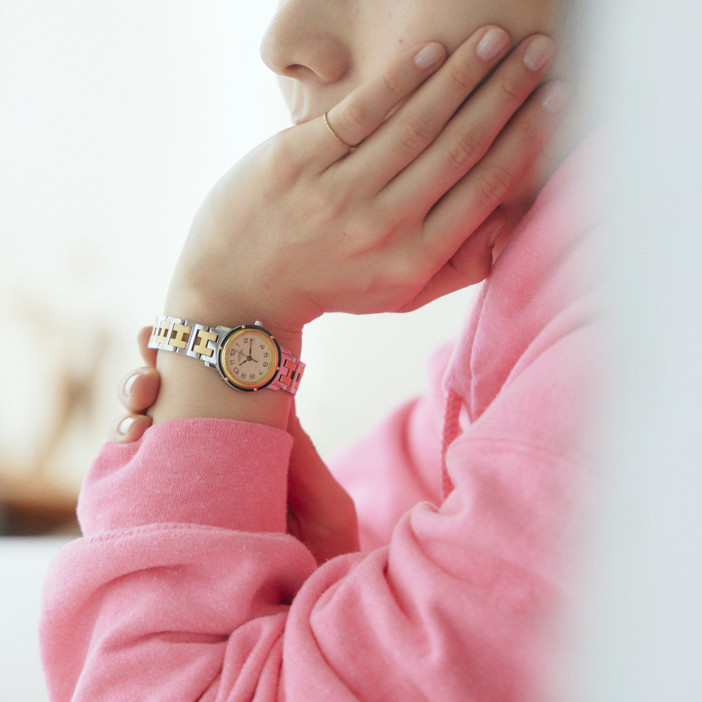 客船の窓から着想を得たケースと「H」を模ったベルトが目を引く、エルメスのレディースウォッチを代表する人気モデル。
