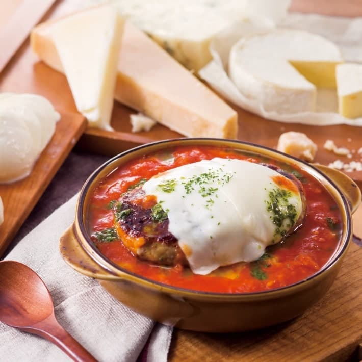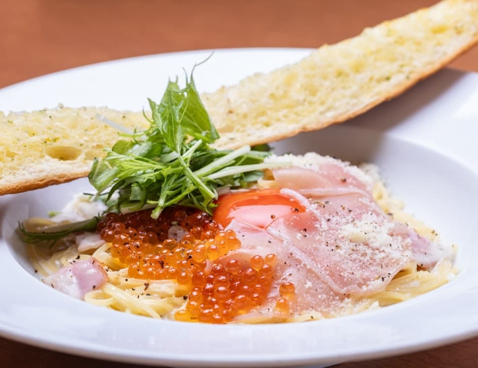 人気の高い素材のいくらと生ハムを乗せたプレミアムなカルボナーラに、ミオ30周年を記念して、長さ30㎝のガーリックトーストをパスタと一緒に盛り付けた大満足の一皿です。