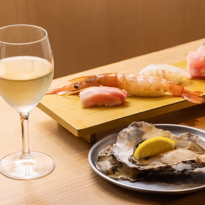 おまかせ寿司3貫+牡蠣1個+ワイン1杯のお得なセットです。