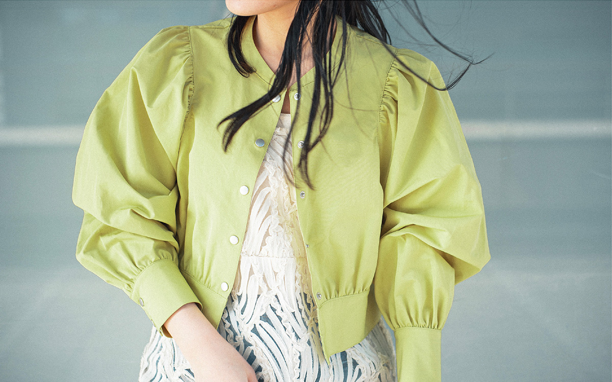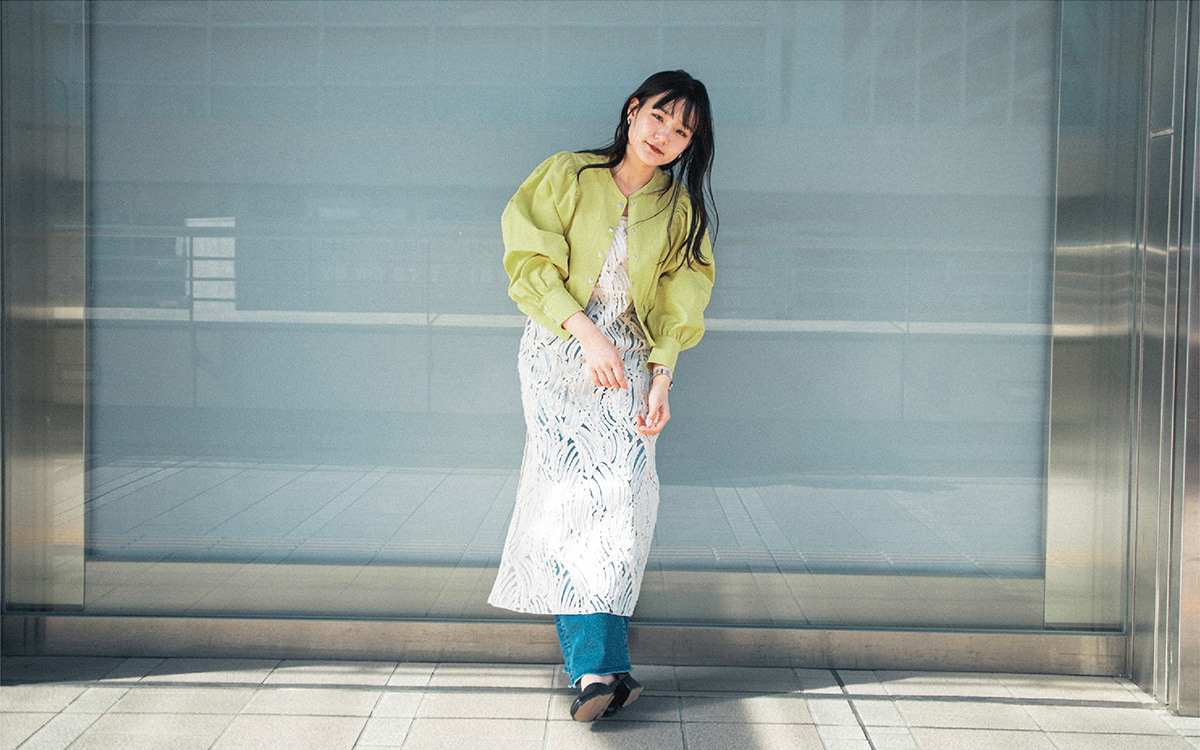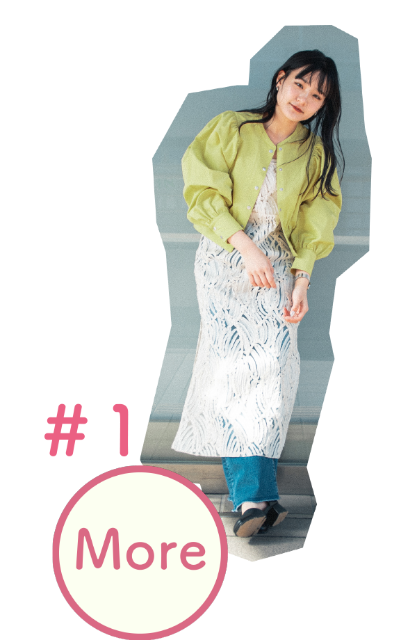 ソデボリュームギャザーブルゾン ¥5,940・バテンレースワンピース ¥7,920・ソウバリニットタンク ¥3,960・デニムWウエストストレートパンツ ¥8,800・セパレートパンプス ¥6,930
