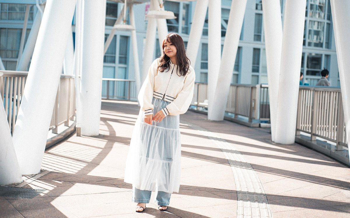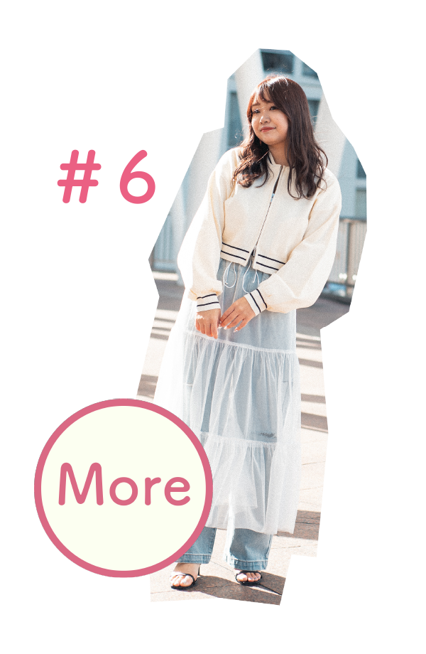 ラインニットブルゾン ¥7,920・チュールティアードスカート ¥6,490・ダメージデニム ¥6,930