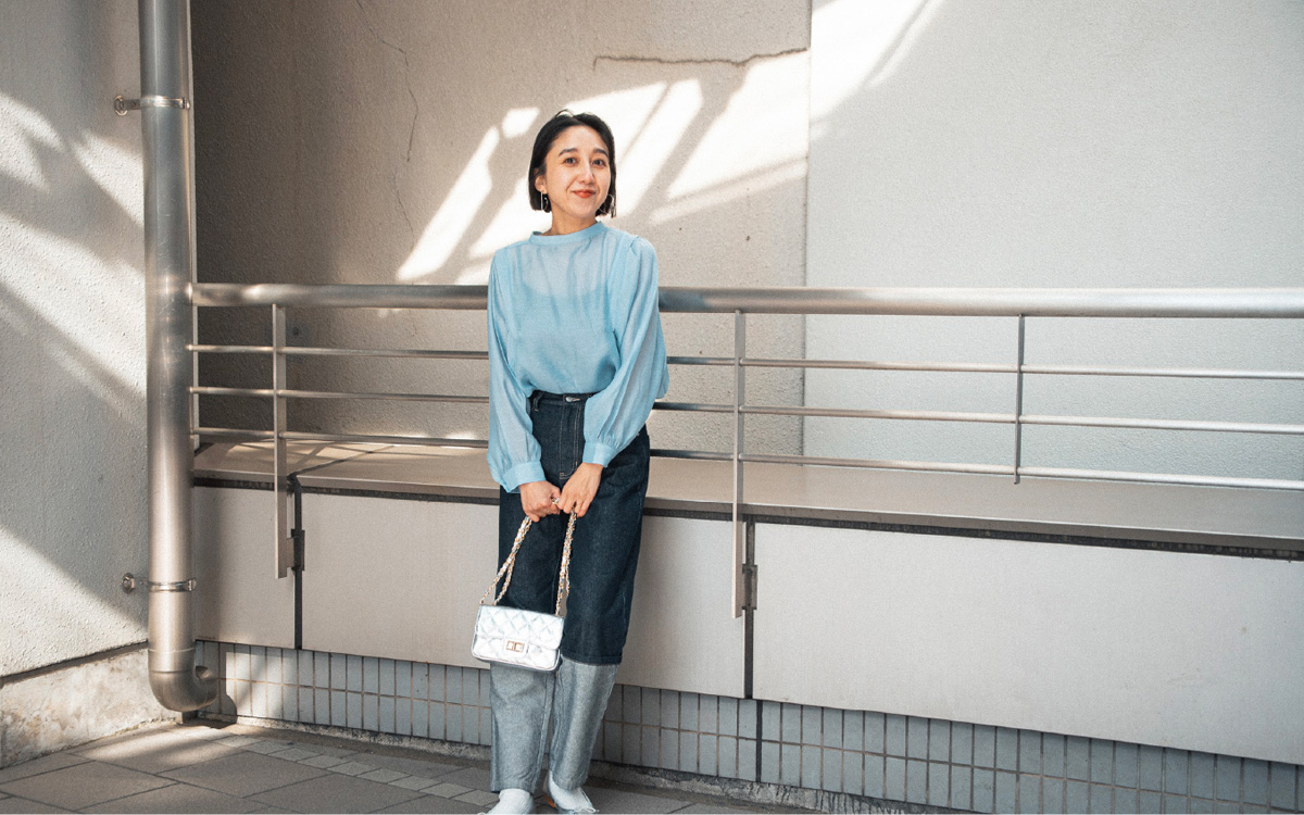 【フレディ エミュ】シアー前開きギャザースリーブブラウス ¥8,580・【フレディ エミュ】ロングロールアップデニムパンツ ¥10,780・【レメ】レザーバレーシューズ ¥12,100・【オーレンティ】メタルレザーキルトチェーンバッグ ¥16,500