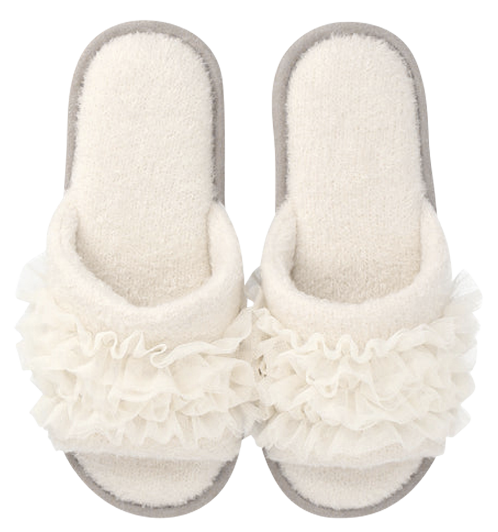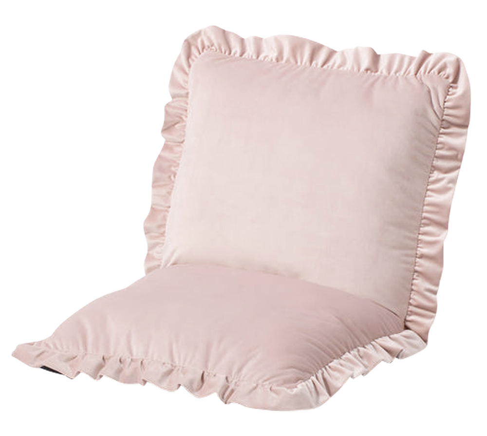カラン フロアチェア S ¥5,980、リリーユ クッション ¥3,200、モイストニット フリルルームシューズ ¥2,700