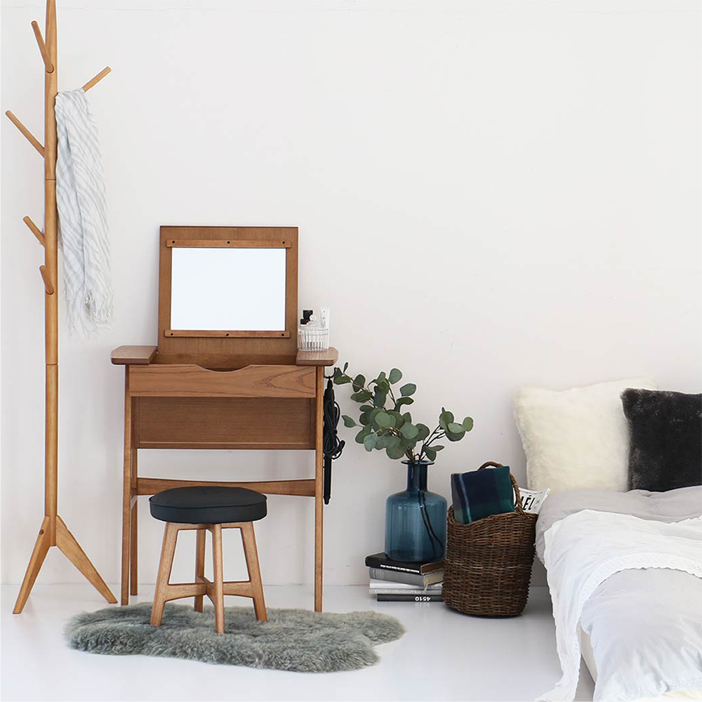 トレド ドレッサー&スツール(本体W620×D380×H700mm/スツールW320×D320×H385mm)¥29,700、ノートン ハイテーブル(W900×D450×H600mm)¥15,840、シュリンプソファ(W1560×D850×H800mm)¥54,780