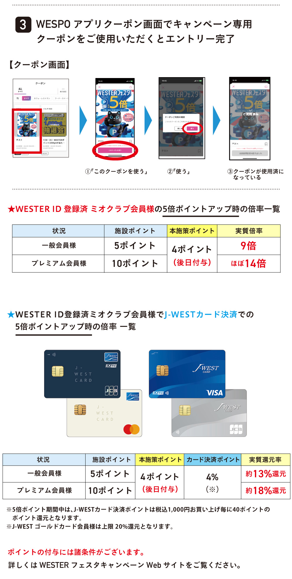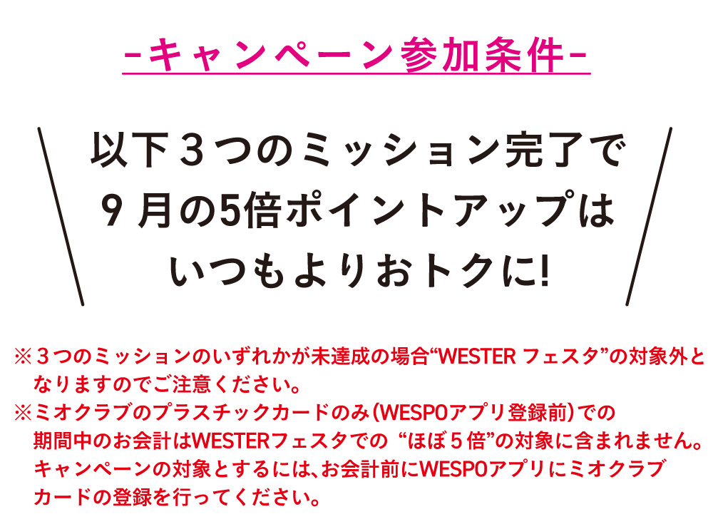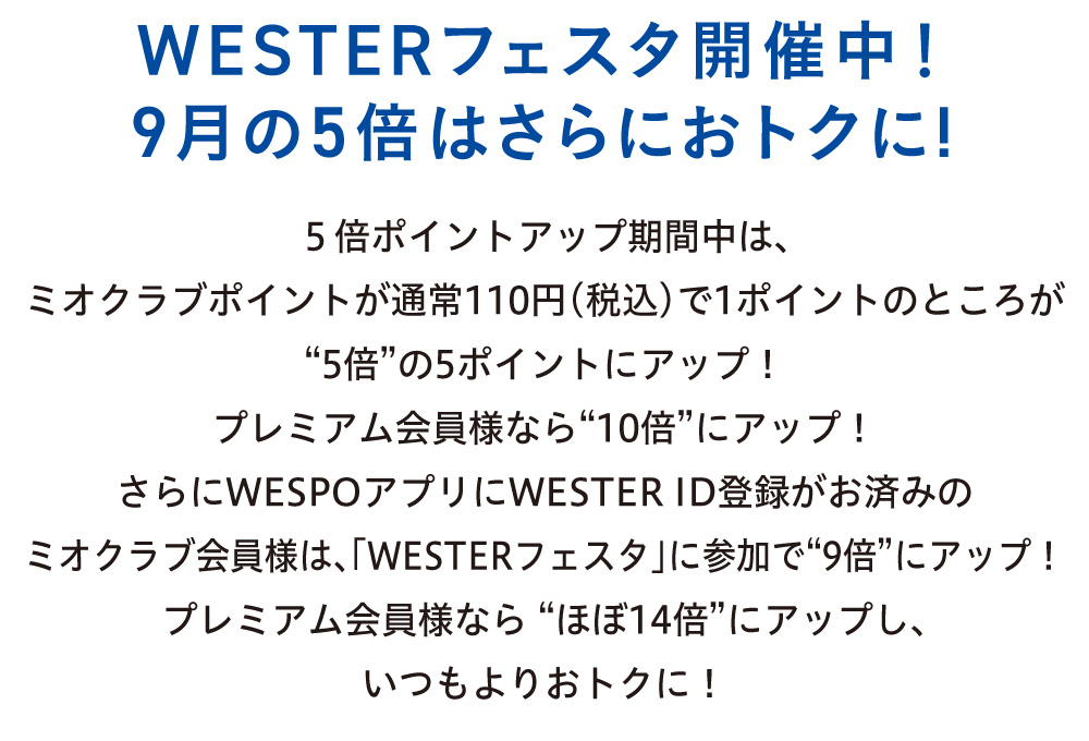 ※ミオクラブのプラスチックカードのみ(WESPOアプリ登録前)での期間中のお会計はWESTERフェスタでの“ほぼ5倍”の対象に含まれません。キャンペーンの対象とするには、お会計前にWESPOアプリにミオクラブカードの登録を行ってください。