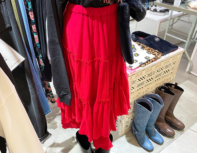ボリュームたっぷりのティアードスカート。オールゴムで着心地抜群!ベーシックなオフ、ブラックに加え、パキッとしたレッドやレトロなギンガムチェックを揃えました。それぞれ異なった印象でコーディネートを楽しめます。トップスインしたスタイリングや、クロップド丈トップスと合わせたバランスの良いスタイリングがおすすめ。