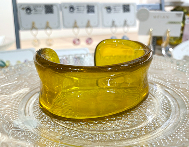 大振りな見た目のイエローカラーのバングルは、コーデのアクセントとしておすすめ。クリア素材で透け感があり、涼し気な印象にしてくれます。