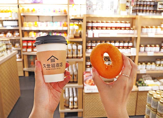 続いて「久世福商店」へ。こちらは、“ザ ジャパニーズ グルメストア”をコンセプトに日本各地で吟味したおいしいものが並ぶセレクトショップです。テイクアウトコーヒーもドメスティックブランドにこだわり、神戸に本社のある「UCC」が開発した“ラルゴ マイルドロースト”という豆を使用。“究極のコーヒー”と名付けられるほど香り高く、オーダーすると香ばしいアロマが濃厚に漂います。これだけで癒される〜。