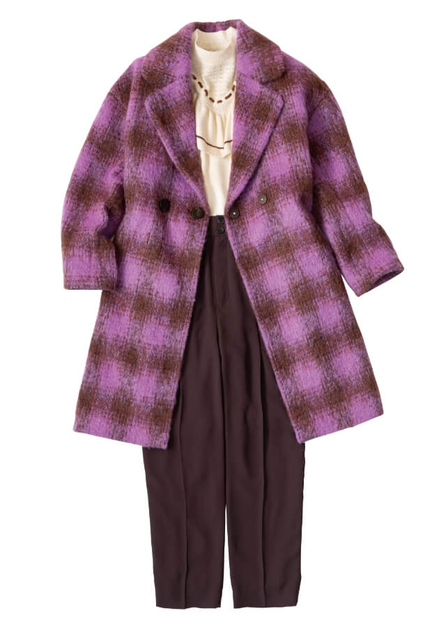 秋の主役になるシャギー素材のコートは、トレンドも感じさせつつ長く着られるスタンダードなデザイン。パープルとブラウンの配色が可愛く秋冬の季節が待ち遠しい気分に。ぼかしたチェック柄は他のアイテムと合わせやすく着回し力が高め。短め丈なので小柄な人もバランスよく着こなすことができます。ウール・モヘア混の上質な生地を使用した軽くて暖かいコートは、秋冬に使えること間違いなし!