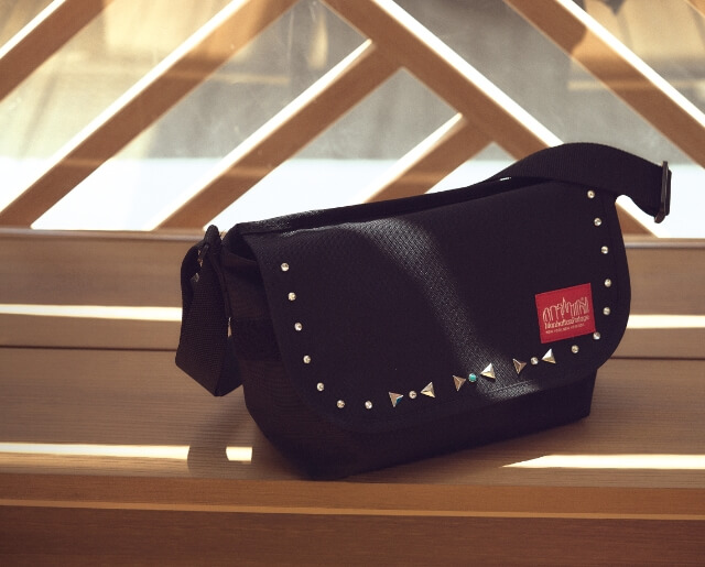 人気のメッセンジャーバッグが、オリジナルスタッズをちりばめたミオ限定デザインに。コンパクトながら広めのマチで収納力も◎。間口の広いB5サイズで身の回りの品がしっかり収まる大きさ。内側にジッパー付きポケットがあり、細々とした小物を入れられます。ベルト幅が薄くスタイリッシュな雰囲気。秋のおでかけに連れていきたい優秀バッグです。