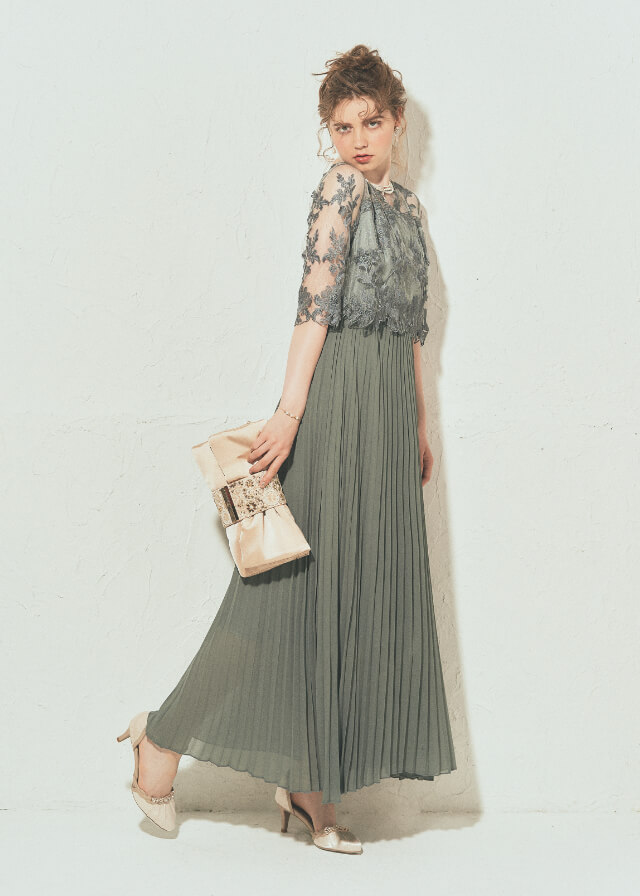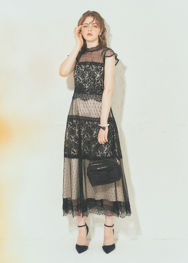 繊細なレースとドットチュールの組み合わせが印象的なドレスは、裏地との配色がポイント。スタイルを良く見せてくれるティアードラインで、女性らしい清楚な美しさを演出します。結婚式などフォーマルなシーンではブラックの小物を合わせてきちんと感を。アクセサリーには艶感をプラスしてくれるパールがおすすめ。普段のデートや女子会では、ライトグレーやピンクなど明るめの小物をプラスすることで、より華やかな印象に仕上がります。