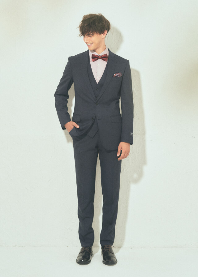 メンズのお呼ばれスタイルは、きちんと感が出るスリーピースがおすすめ。トレンド感のある配色で、式典からビジネスまで幅広く着用できるものをセレクト。赤の蝶ネクタイとチーフをアクセントにすれば、かわいくてクールな、おしゃれなメンズお呼ばれスタイルの完成です。