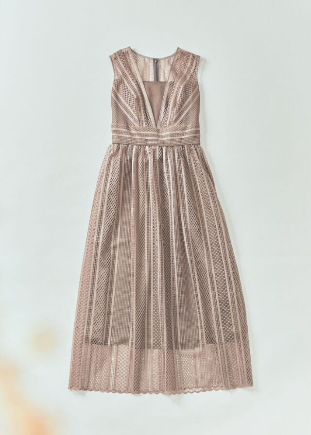 縦のラインが美しいボーダーレースを使った1着。レースとジョーゼットの絶妙な組み合わせで柄感を程よく浮き上がらせ、フェミニンでモードな雰囲気を演出します。裾がシースルーになっているので小柄な女性でも重たい印象にならず、ボーダーの縦ラインとウエストシェイプで美シルエットが叶います。足の露出が控えめなアンクル丈なのでフォーマルな式典にもぴったり。ドレスではめずらしいS・M・Lの幅広いサイズ展開もうれしいポイント。