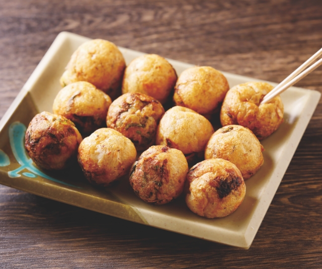 たこ焼きの原点、ラヂオ焼き!たこの代わりに牛すじ、こんにゃく、ネギが入っていて、たこ焼きとはまた違う歯ごたえと味わいです。そのまま食べるのが一番おいしいので、まずは何もつけずにどうぞ!