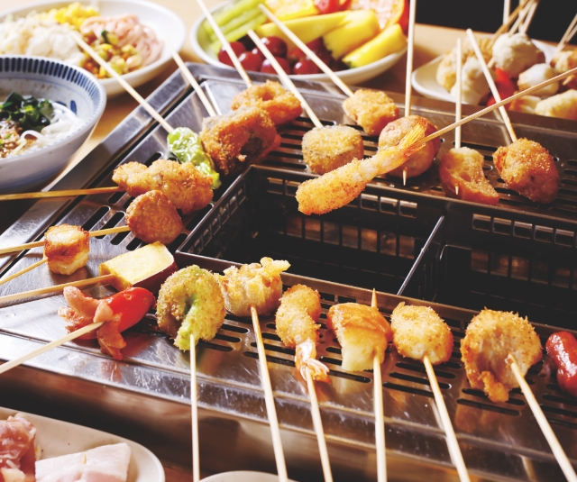 熱々の串カツを気軽に好きなだけ楽しみたいなら、ぜひこちらへ。串カツの他にも、定番の串ネタから季節やフェアで変わる串ネタを豊富に取り揃えています♪練り粉とパン粉をつけて揚げるのが定番ですが、食材本来のおいしさを味わえる素揚げもおすすめ。ガッツリ食べたい気分なら、串カツを乗せたトッピングカレーをどうぞ。素揚げベーコンをサラダにトッピングする技もお試しあれ。