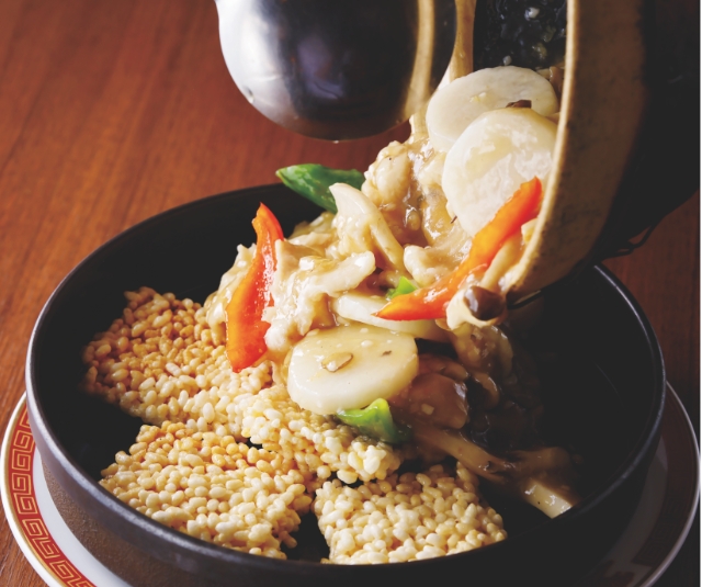 ジュワ〜っと広がる音が食欲をそそる1品。鉄鍋に乗せたおこげの上に、鶏ときのこの五目あんをオン!おこげの食感の変化も楽しめますよ。鉄鍋棒餃子が名物の紅虎軒では、カジュアルに楽しめる中国料理を楽しめます。