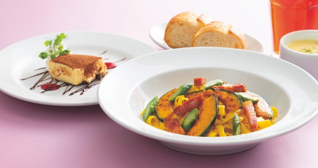 和洋折衷の本格パスタを得意とするペルコラで、秋の食材を使った選べる生パスタが天王寺ミオ限定のお得なセットメニューに。スープ、パン、ドリンクと、選べる日替わりデザートが付いています。その他、ピザのメニューも豊富。天王寺・阿倍野エリアでイタリアン気分の時はぜひこちらで♪