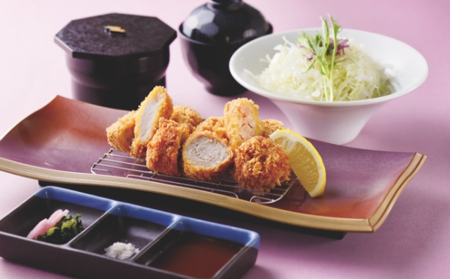 KYKを代表する3種のかつ「国産ロースとんかつ」「ヘレとんかつ」「エビかつ」が一度に楽しめる、この期間だけの天王寺ミオ限定御膳。いろんな種類を少しずつ食べられるよくばりメニュー。そのほか、旬の野菜を豚肉で巻いて仕上げるKYKオリジナルの「季節の手巻き野菜とんかつ膳」(1,410円)もおすすめです。