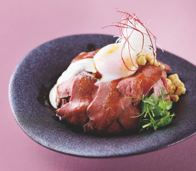 じっくりと低温調理した自家製ローストビーフをたっぷり乗せて丼仕立てに。やさしい酸味のヨーグルトソースと相性抜群です。温玉やピーナッツ、セロリ菜など、味変要素が豊富。最後の一口まで「美味しい!」の満足感が続く1品です。