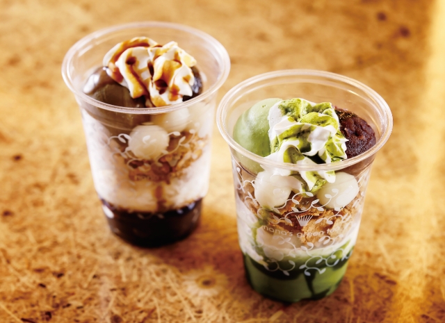 人気の和パフェが2021年の今季からほうじ茶・抹茶のゼリーをリニューアル。オリジナルブレンドの茶葉を使用しています。濃厚なゼリーにソフトクリームと玄米フレーク、お茶の香りが香ばしいアイスクリームをトッピング。甘さ控えめのホイップクリームや餡も名脇役。抹茶味には自家製抹茶蜜を、ほうじ茶味には黒蜜を使用しています。白玉のモチモチ感を楽しんで。テイクアウトして近くのイートインスペースで味わうのがおすすめ。