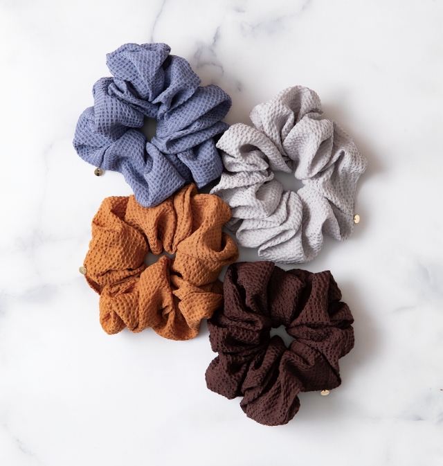 優しいコットンのような肌触りのシュシュは、細かく入ったシボの質感が魅力。トレンドカラーや定番カラーなど豊富な全5色を展開しています。お仕事にもデイリーにも使える便利なヘアアクセ。髪を巻かなくてもシュシュでまとめれば簡単きれいにヘアアレンジできちゃいます。忙しい朝におすすめです。