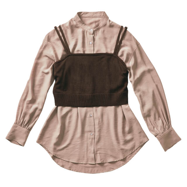 チュニックシャツとニットビスチェがセットになったアイテム。ブラウン×ベージュのワントーンカラーは、天王寺ミオ限定色。程よい透け感のシアーシャツと、ビスチェは薄手のニット生地なので、秋から冬までしっかり着回せるのがうれしい。シアーシャツとビスチェ、どちらも単体でも使えます。ビスチェはTシャツ合わせでカジュアルに着ても◎。