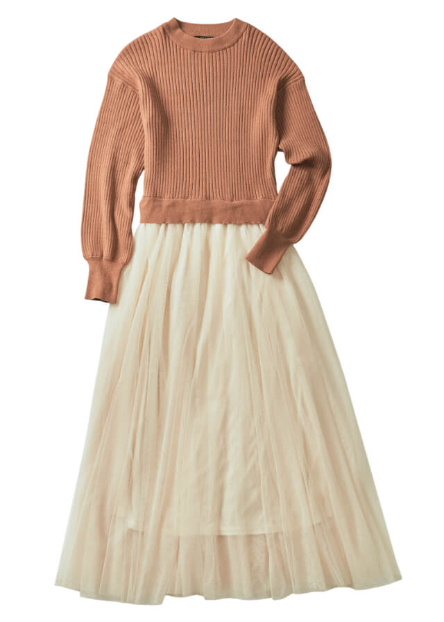 ベージュニットとチュールスカートがドッキングしたワンピース。フレアシルエットで女性らしく柔らかな印象に。これ1枚でおしゃれなコーディネートが完成するので、お出かけ準備もカンタンです。