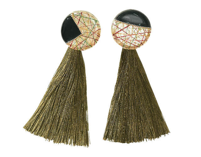 デザインがそれぞれ異なる丸型のカボションは、ハンドペイントで制作された1点もの。存在感があるので、ワンポイントとして取り入れるだけでおしゃれ度がグッとアップ。落ち着いたカラーのタッセルは光沢感があり、上品な秋らしさも演出します。