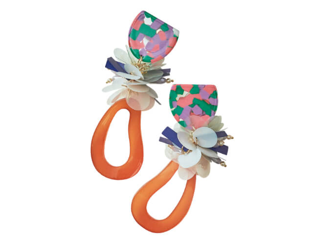 オリジナルパーツを使ったハンドメイドのアクセサリー。揺れるとスパンコールがキラキラと光る華やかさが魅力。明るい色味とボリューム感ある形なので、シンプルなトップスや秋トレンドのワントーンコーデとの相性が良いデザインです。