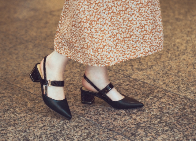 ブラックにべっこう柄が利いた天王寺ミオ限定カラーのパンプス。低めの5cmヒールとバックストラップで、安定感のある履き心地が魅力。すっきりとしたポインテッドトゥで大人な女性の雰囲気に近づけます。パイソン柄ながらベースが黒で落ち着いた印象。毎年ランダに登場する定番アイテムです。スカートとパンツスタイルどちらにも合わせやすく、レザーアイテムとのコーデも相性抜群。実は隠しゴム使用で、楽に脱ぎ履きできます。普段はスニーカー派の人にもおすすめできる履きやすさです。
