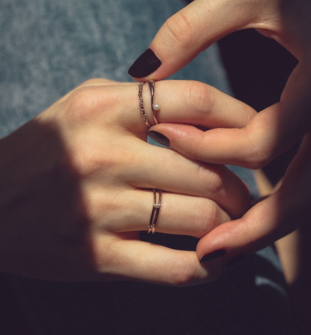 女性の持つ多様な魅力をコンセプトにしたリング。可憐なきらめきをホワイトトパーズで、力強さを曲線と直線で表現しました。肌に馴染むK10ミストピンクゴールド。柔らかい雰囲気の人におすすめです。小粒のムーンストーンや淡水パールをあしらったリングは重ね付けするとよりトレンド感のあるコーディネートに。今季トレンドのイヤーカフと合わせるのも◎。まずは小物から新しい季節を感じませんか?