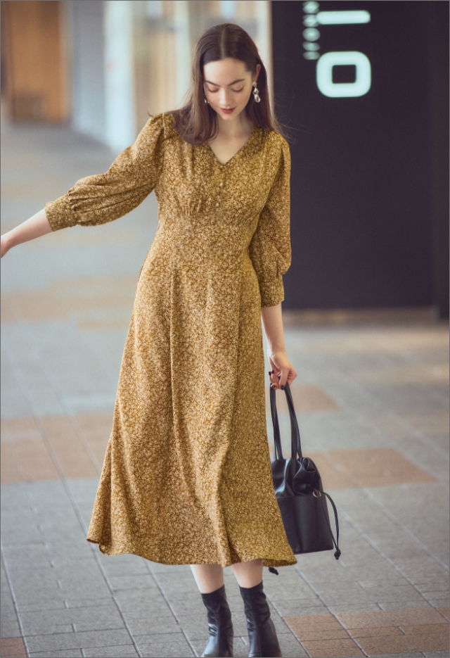 ハイウエスト切り替えでスタイルアップが叶うワンピース。絶妙なネックラインが顔まわりとデコルテをすっきり見せてくれます。落ち着きのある花柄をちりばめたレディライクなデザイン。さらりとした肌触りで、秋から冬まで長く着こなせます。注目のワンピースをワードローブに取り入れて、2021秋冬を華やかに過ごしましょ。