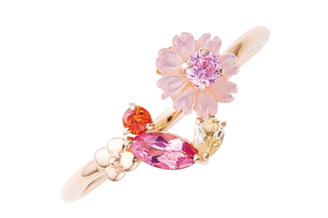 10月の誕生花であるコスモスをモチーフにした愛らしいリング。K10ピンクゴールドの金素材を使用しています。天然石やシェルを散りばめた繊細なモチーフはまるでブーケのよう。肌なじみのいいピンクシェルと柔らかい色味のピンクトルマリンが女性らしく優しい雰囲気を引き出します。華やかなデザインなので、人差し指や中指に着けて手元を目立たせるコーデがおすすめ。同デザインのネックレスも展開中です。