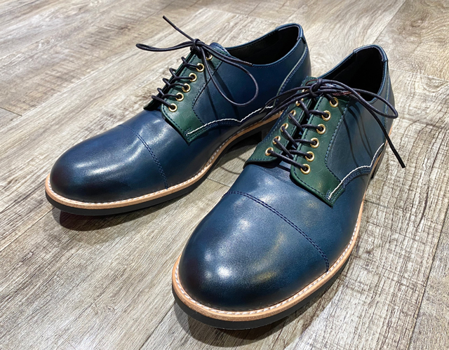 限定6足の、ARGIS × ZUCUZUCAコラボのオリジナルカラーシューズ。 3mm厚のヌメ革にレザーライニングを使用していて、かっちりとした仕上がりになっています。 シンプルなデザインながらゴールドの金具やサイドの太いステッチが効いていて、フォーマルからカジュアルまで幅広く使えます。