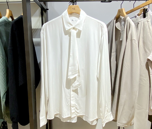 同生地のスカーフが付いたシャツ。 スカーフは一折りしてバランスを整えて付けていただくスタイルがおすすめです。 スカーフ部分は取り外しができるので外していただければレギュラーカラーシャツとしても着ていただけます。 生地はマットな質感とトロミのある表情が特徴的なモダール生地を使用。 ややオーバーサイズにしているので一枚で今らしいスタイリングを作れます。