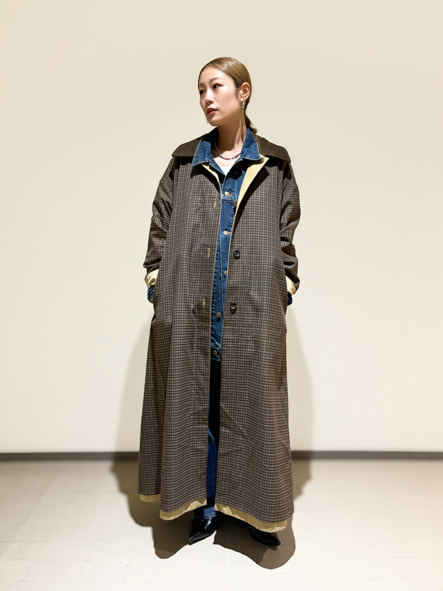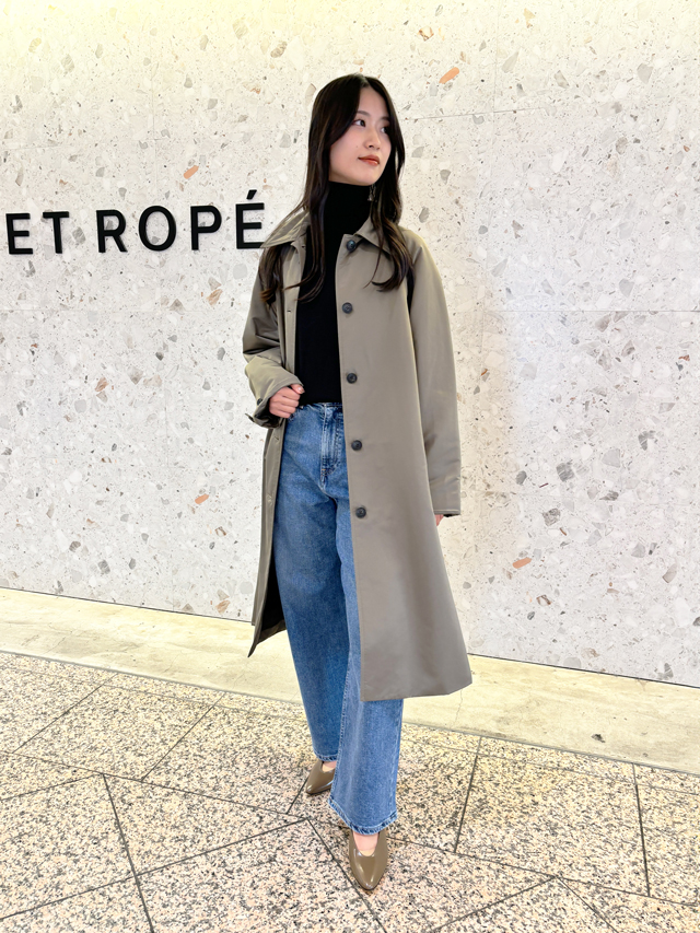 人気デニムブランド「KURO for SALON」の別注セットアップと合わせたスタイリングがこちら。短め丈のジャケットがメンズライクな印象を和らげて女性らしい印象に。落ち感のあるコートとデニムの組み合わせが大人の抜け感を演出します。