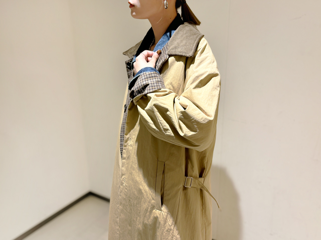 寒い日も安心なのが「プードゥドゥ」のハイネックコート。ラグランスリーブで袖周りにゆとりがあり、厚手のニットもすっきり着られます。アレンジしやすいリバーシブルのストラップも魅力。袖口を折り返すと別地が見え、手元にアクセントを作れます。