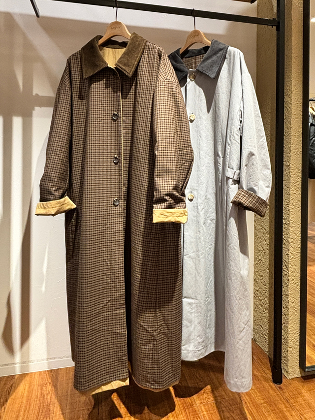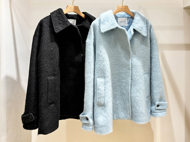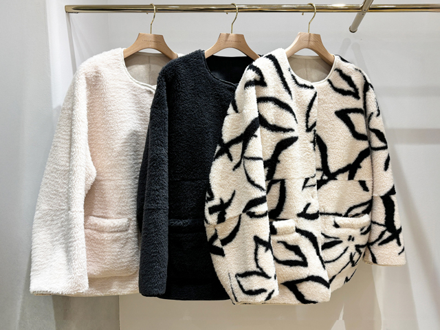 「プードゥドゥのアウターは肩回りがゆったりしているので、厚手のニットも着込めて肩が凝りにくいですよ」とスタッフさん。羽織ってみると見た目以上に軽くてほどよい丈感のアイテムが多いので、気になったらとにかく試着あるのみです!
