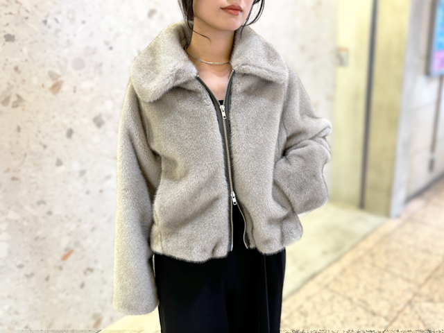 毛足が長いファー素材のボリューム感が可愛い「プードゥドゥ」のブルゾン。高めの襟をボタンで留めれば防寒性もばっちり。前後の裾にタックを入れた丸みのあるシルエットで、さっと羽織るだけでパーカーのように決まります。