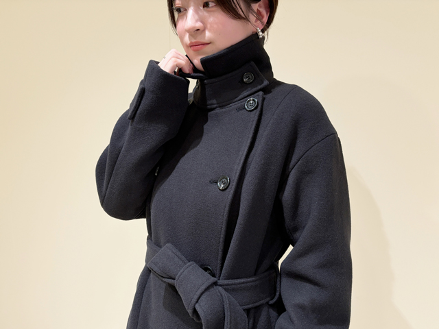 前を閉じてスタンドネックにすると、またひと味違った着こなしができ、防寒性もアップします。ゴールドのメタルボタンがモダンな印象を添える、大人可愛い1枚です。
