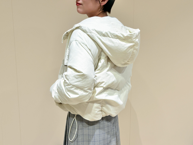 ふっくらしたダウンと大きめのフードが可愛い「プロポーション」のショートダウン。上半身にボリュームが出るので、すっきりシルエットのニットワンピやタイトスカートを合わせるとバランス◎。フランス製ダウンを使用し、保温性も抜群です。