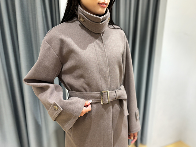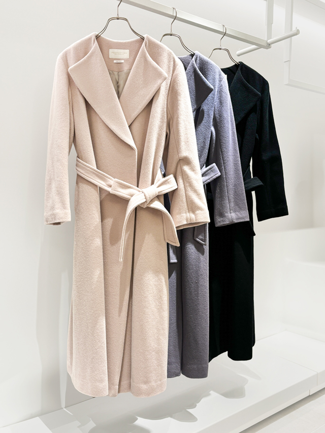 「ジル バイ ジルスチュアート」からは、トレンチワンピースのようなシルエットが特徴のロングコートをご提案。締まったウエストと、たっぷりボリュームの裾が魅力です。ウール90%で軽量ながらあたたか。カラーはベージュ以外にもホワイト、ピンク、ブルーを展開。